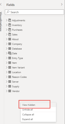 2. Right-click below the fields list in the right-side pane, and select View hidden.